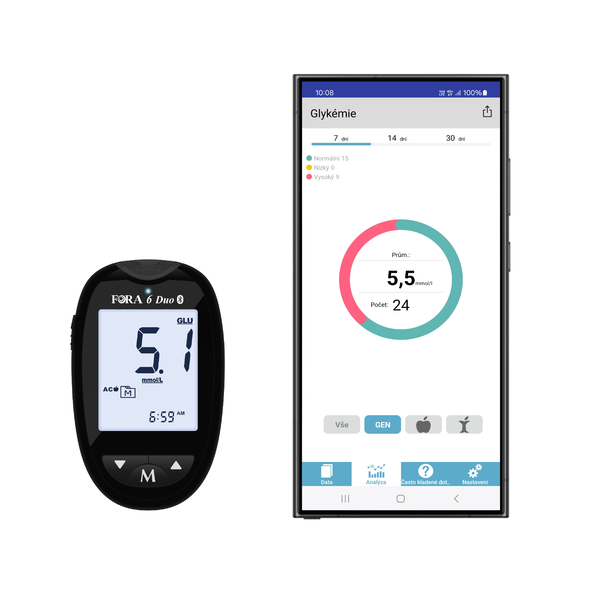 Nejvýkonnější glukometr od švýcarské společnosti ForaCare FORA 6 Duo s velkým podsvíceným displejem, osvětleným portem pro vsunutí proužku a jednoduchou obsluhou mohou používat lidé všech věkových kategorií. Díky pokročilým funkcím si na své příjdou i technicky zaměření jedinci. Glukometr FORA 6 Duo umožňuje díky speciálním testovacím proužků měření i ß-ketonů.
